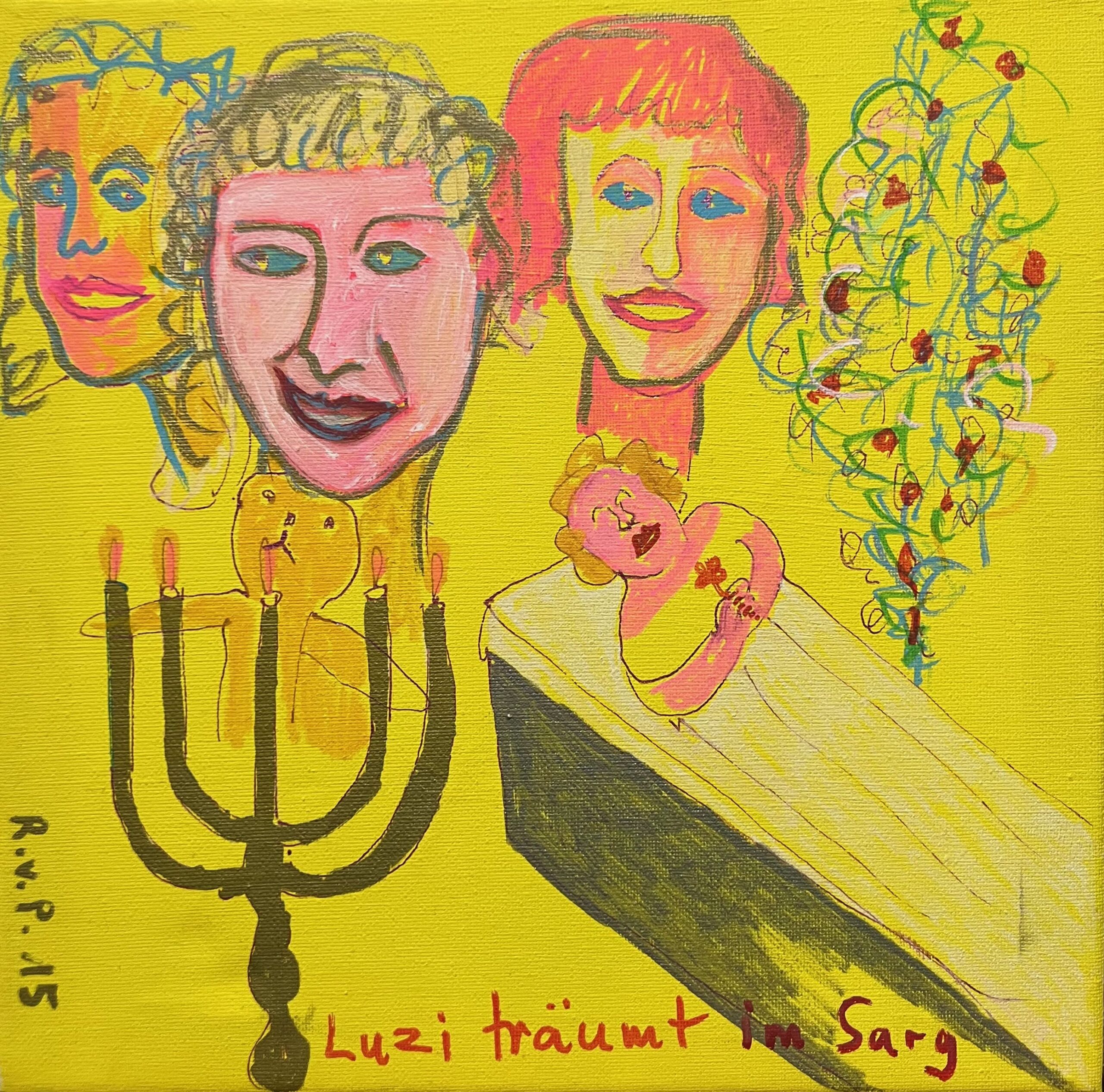 Title: Luzi träumt im Sarg Year: 2015 Medium: Acrylic and marker on canvas Dimensions: 30 × 30 cm